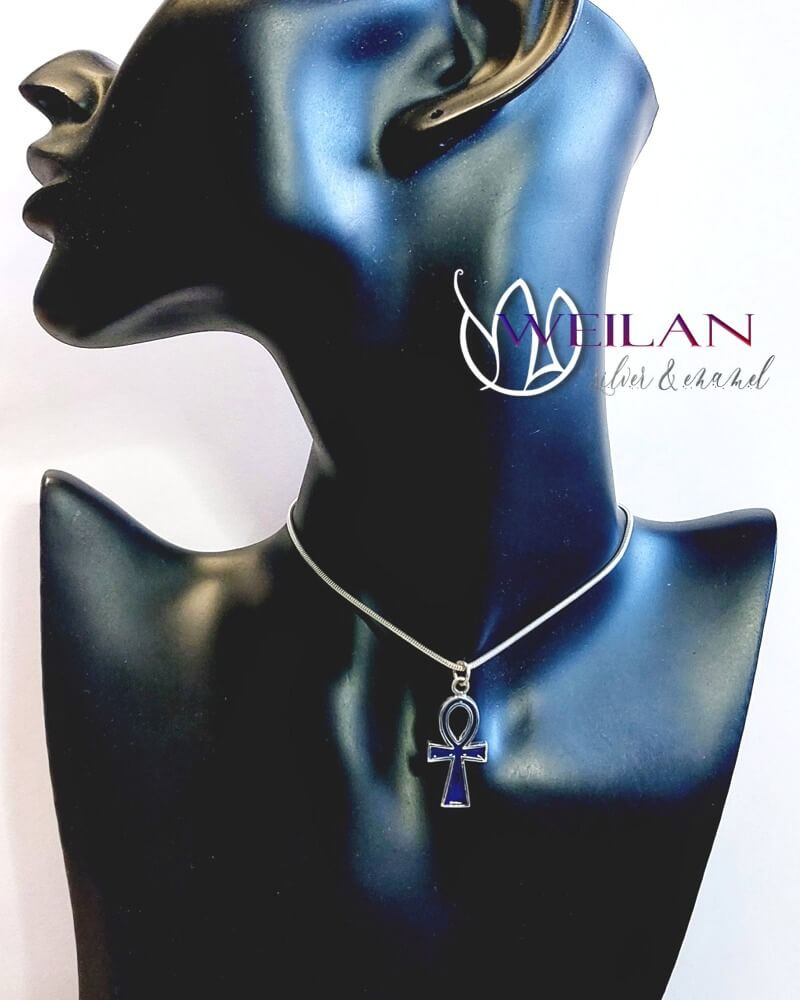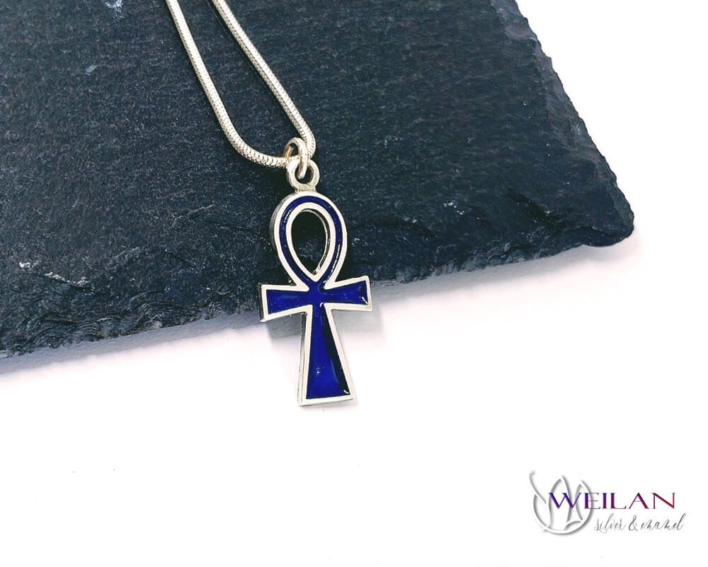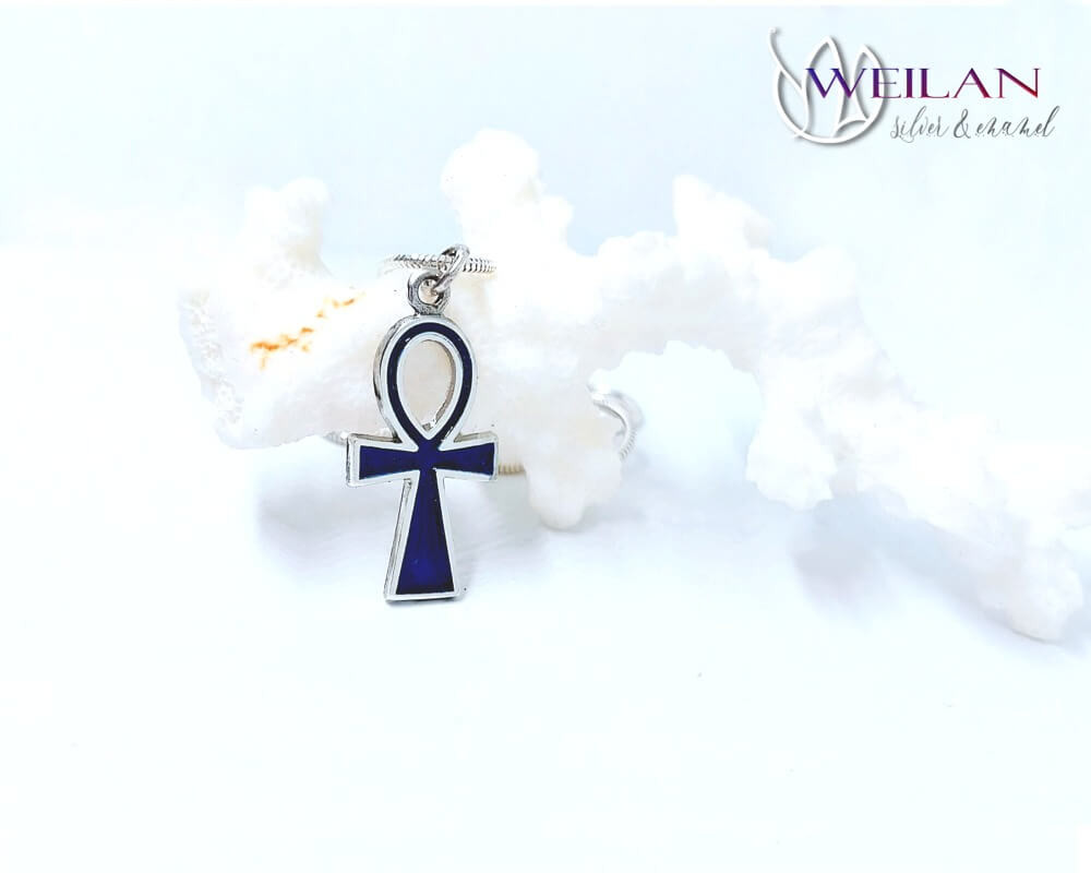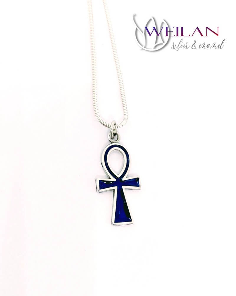 Ez az Ankh kereszt medál ezüst alapra készült, sötétkék zománcozással.