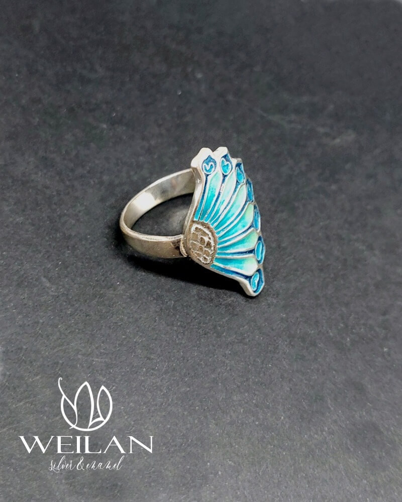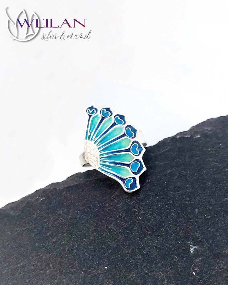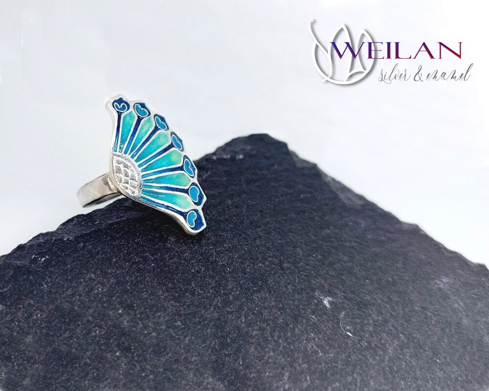 Aprólékos kidolgozású, ragyogó, színes pávatollazatot mintázó, beágyazott zománc technikával kézzel készült, kisszériás tűzzománc gyűrű.  A pávák kiterjesztett faroktollazatát mintázó ékszer legyező formában a kézfejre simul. Az ékszer részletgazdag kialakítása olyan érzést kelt, mintha egy valódi páva szépségét csodálnánk. Az ezüst alapra készült tűzzománc gyűrűn, a türkizkék és türkizzöld árnyalatai csodálatosan vegyülnek össze, hogy létrehozzanak egy igazi mesebeli hangulatot.