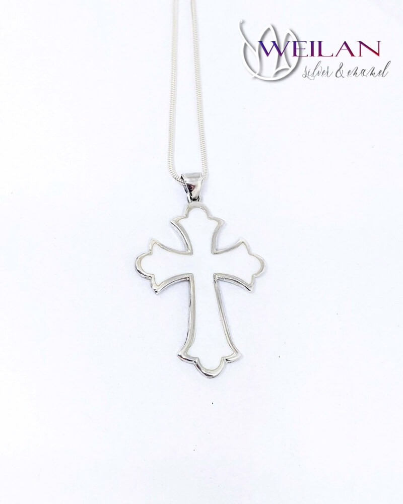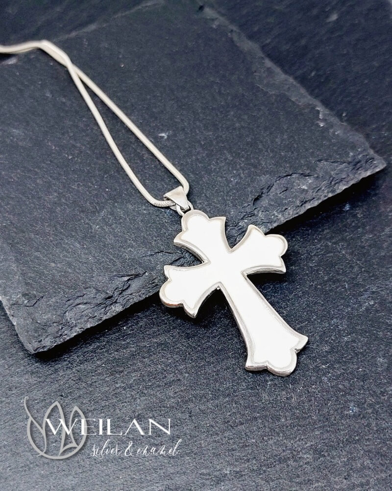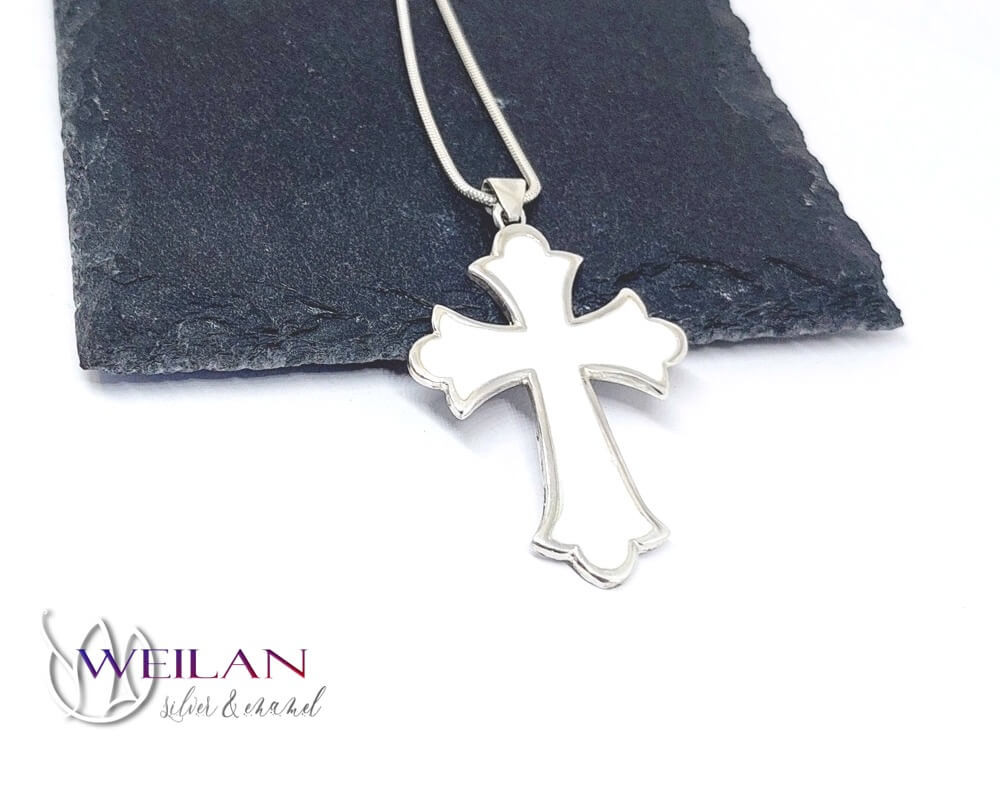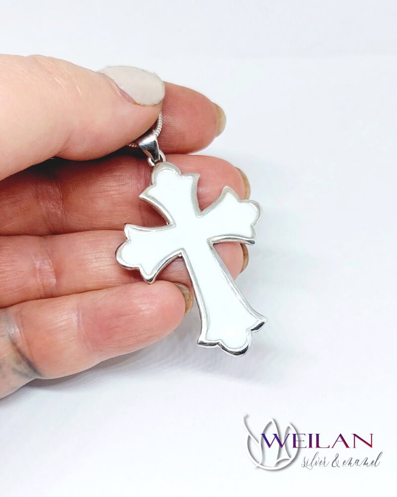 Ez a klasszikus vonalvezetésű, szép kidolgozású, liliomvégű 925 sterling Silver latin kereszt medál fehér színnel zománcozott.