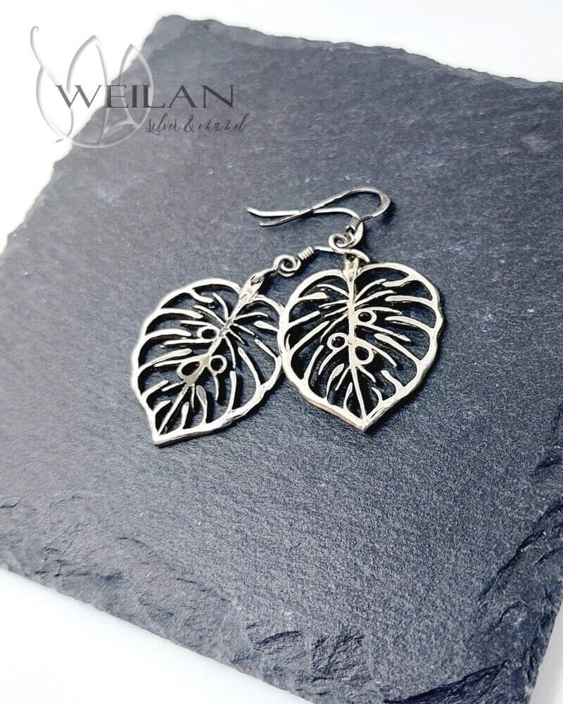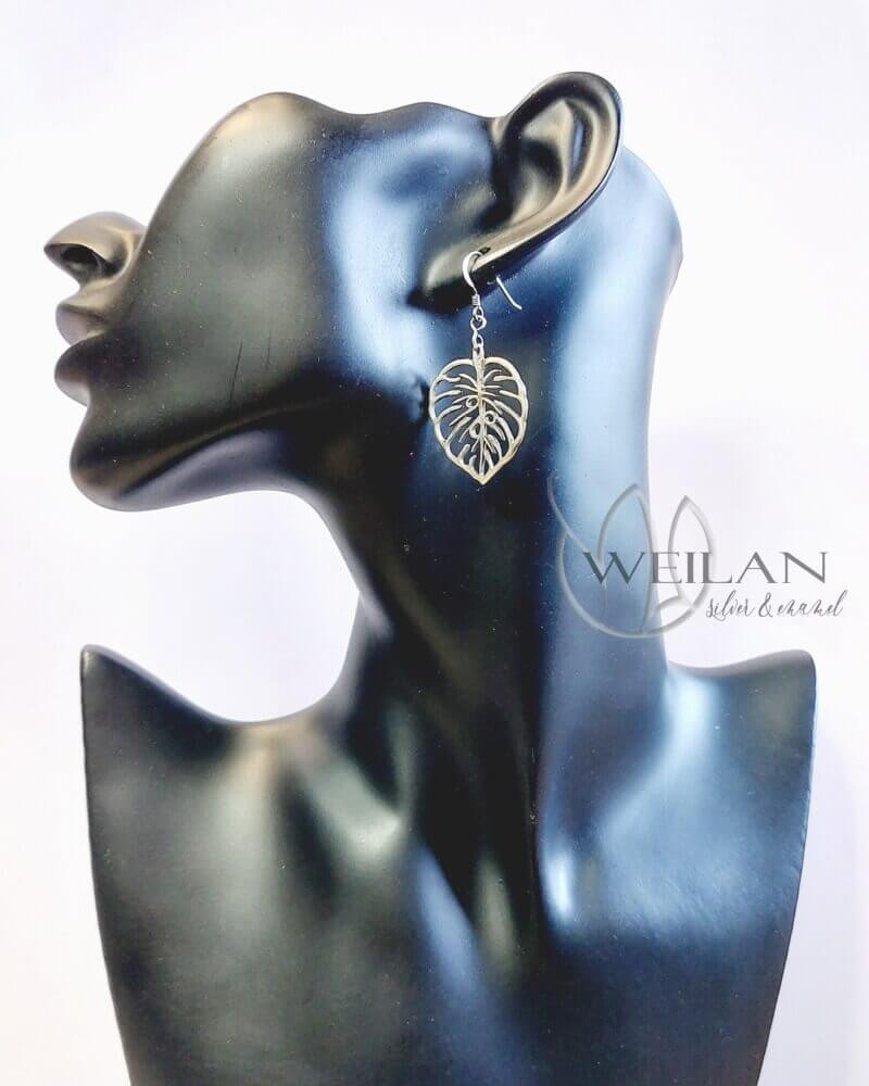 Leaf - Filodendron, monstera ezüst ajour tűzzománc fülbevaló viselése