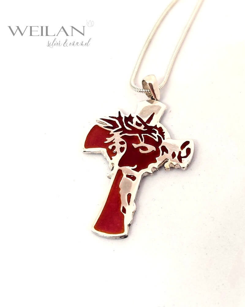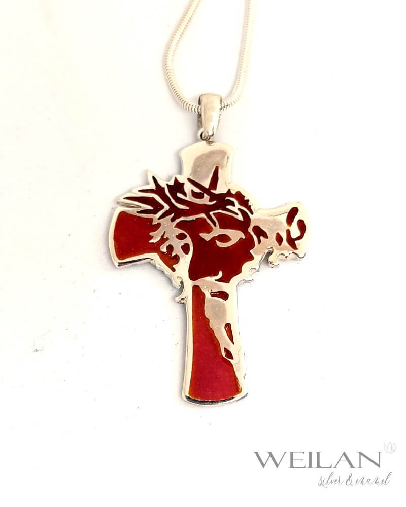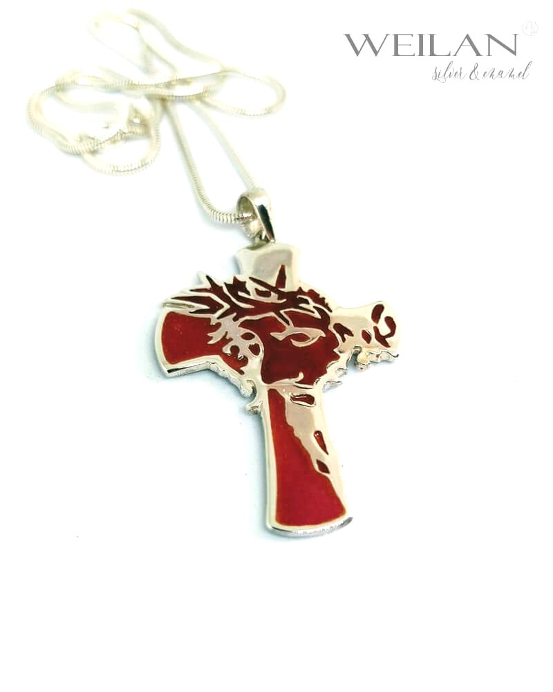 Krisztus arca, ezüst tűzzománc kereszt medál Weilan díszdobozban