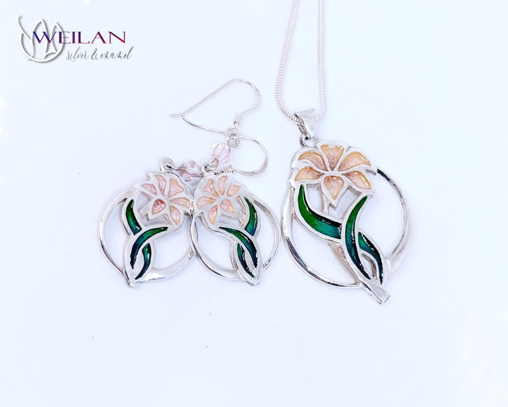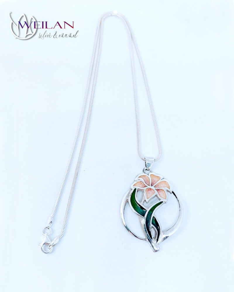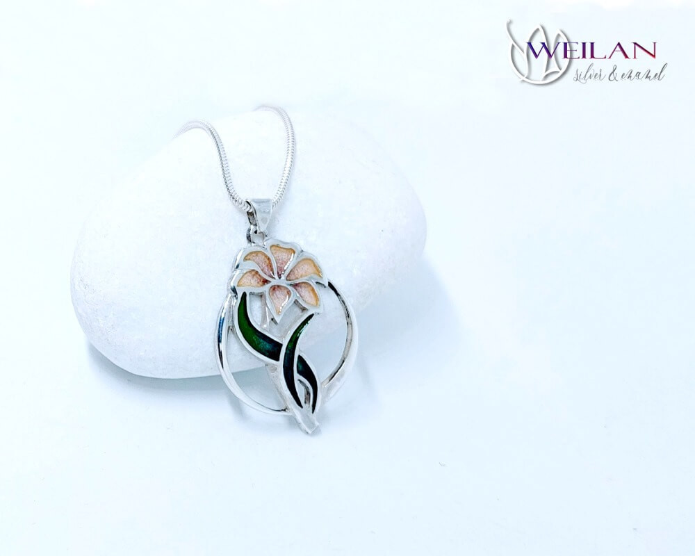 A Liliom ékszerek a tisztaság, a méltóság és a nőiesség klasszikus jelképei. A tűzzománc ékszer finom vonalai és szirmai elegáns, időtlen szépséget sugároznak. A kollekció darabjai ünnepélyes ragyogást kölcsönöznek minden alkalomhoz. Ez a kedves, liliomszálat mintázó egyedi kézműves ékszer, áttört, ezüst alapra készül, rózsaszín és zöld színekkel zománcozva.