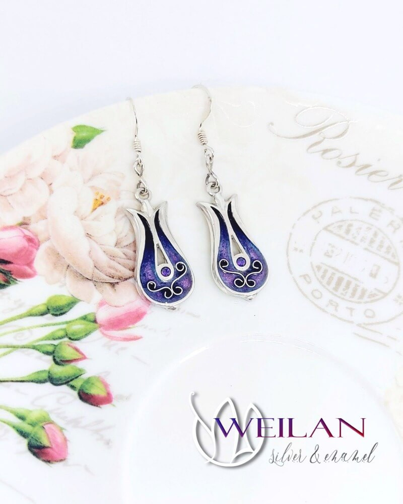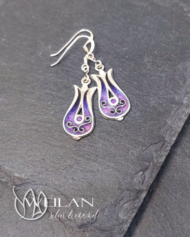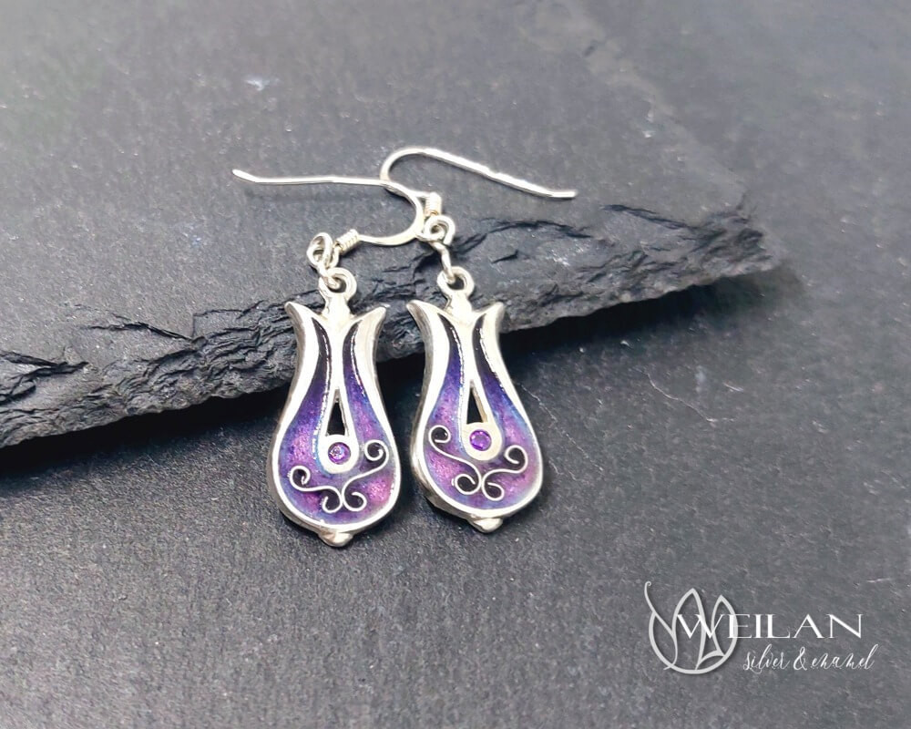 Most ez a gyönyörű, tulipánt formázó tűzzománc fülbevaló ezüst alapra készült, rekeszzománc díszítéssel, ragyogó lila színátmenetben, a középső részén lévő foglalatban lila cirkónia kő ragyog.