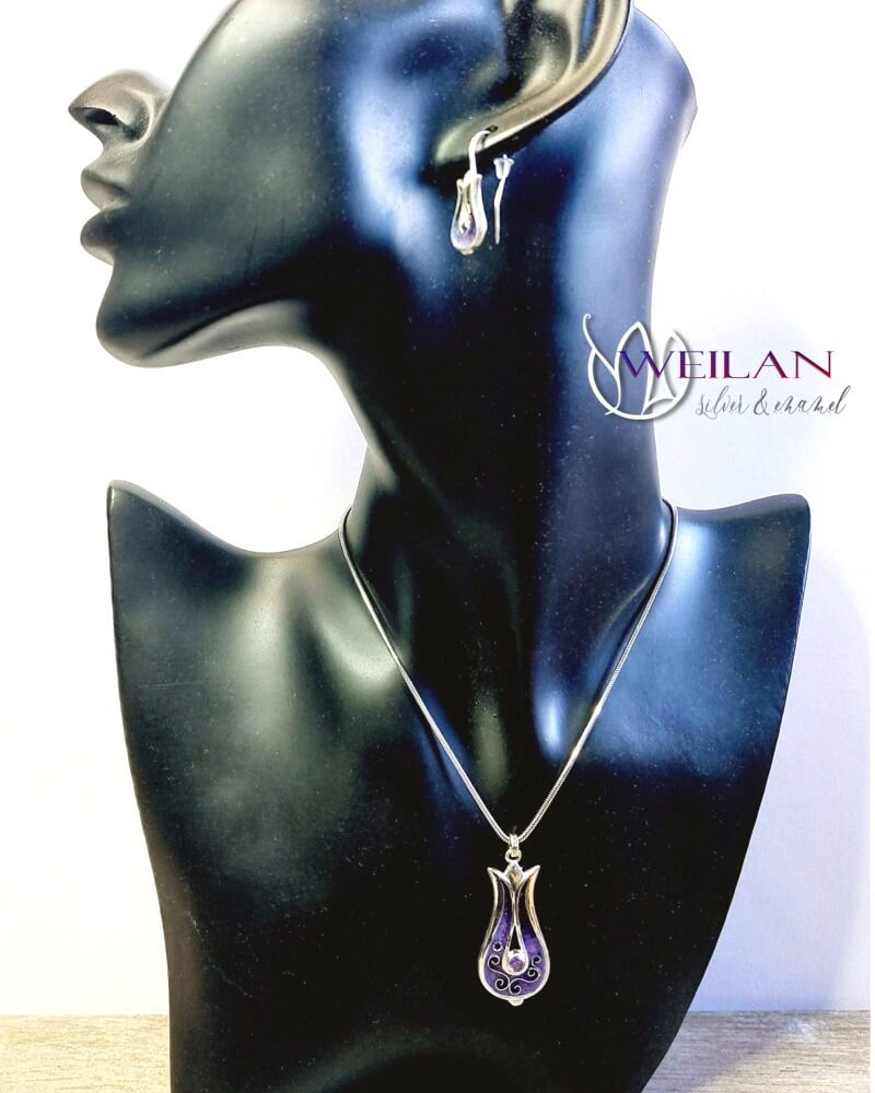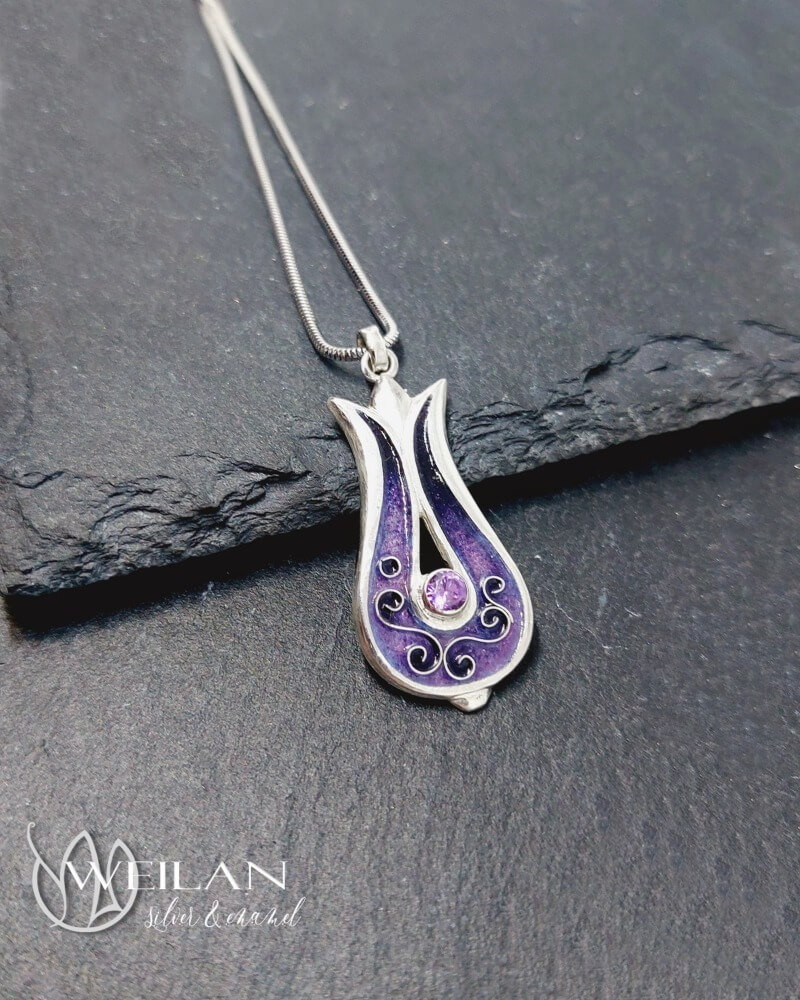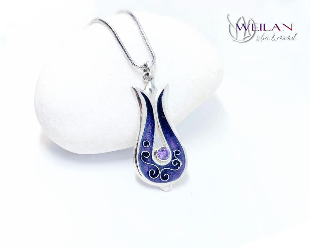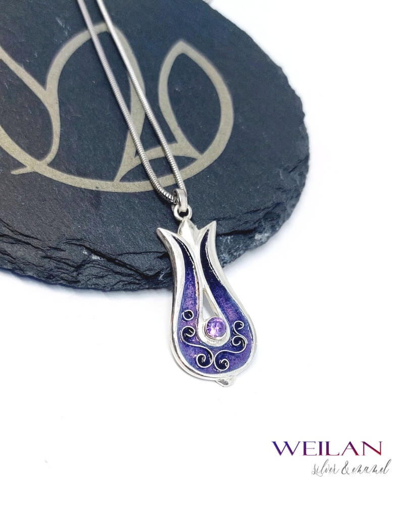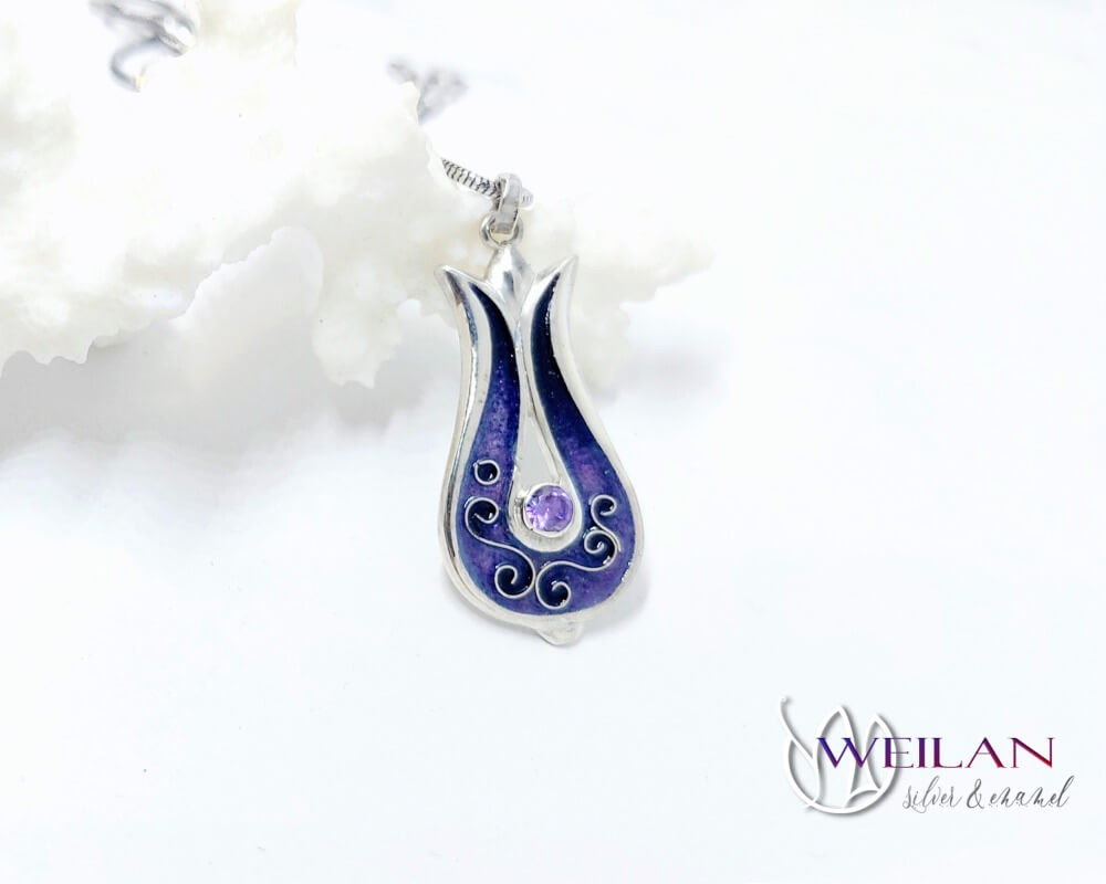 Most ez a gyönyörű, tulipánt formázó tűzzománc medál ezüst alapra készült, rekeszzománc díszítéssel, ragyogó lila színátmenetben, a középső részén lévő foglalatban lila cirkónia kő ragyog.