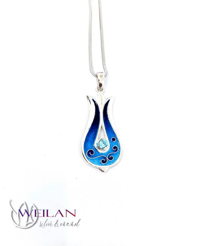 Most ez a gyönyörű, tulipánt formázó tűzzománc medál ezüst alapra készült, rekeszzománc díszítéssel, ragyogó türkizkék színátmenetben, a középső részén lévő foglalatban kék cirkónia kő ragyog.