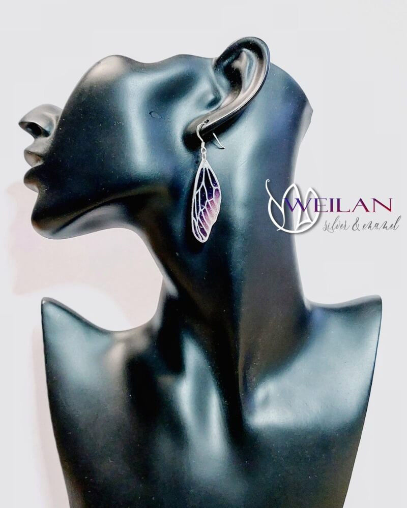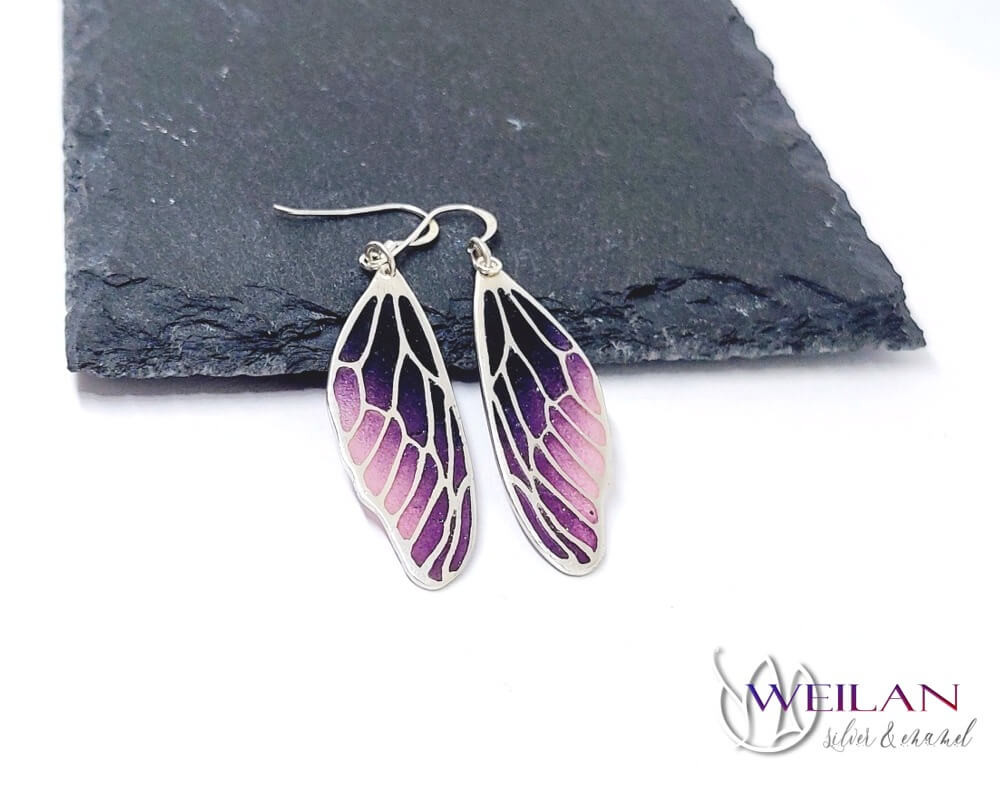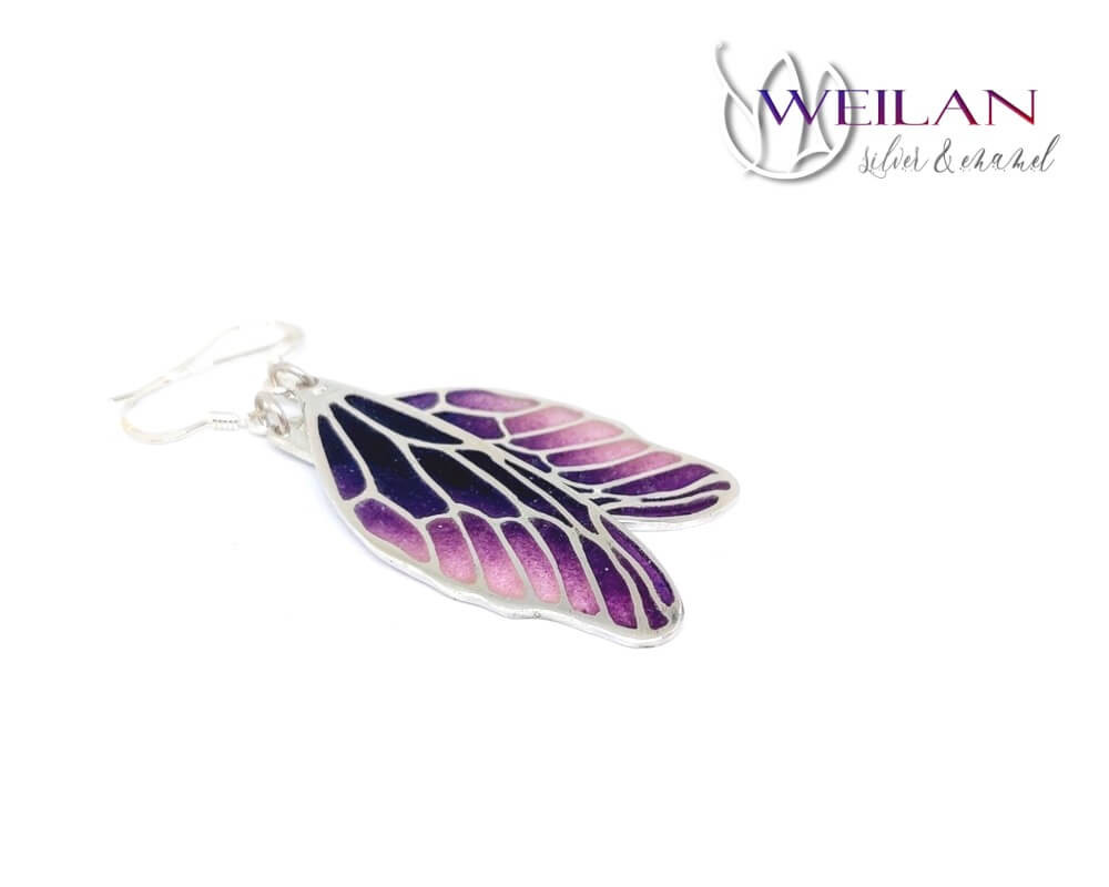 Ez a fiatalos, nőies ezüst azsúr tűzzománc fülbevaló a valódi szitakötőszárnyakhoz hasonlóan fény felé fordítva átlátszóvá válik, lila és rózsaszín árnyalataiban pompázó színei csak úgy ragyognak a napsütésben. Könnyű, kényelmes viselet, mivel a fülbevalónak csak a vázszerkezete készült fémből, a többi része 100% olvasztott üveg.