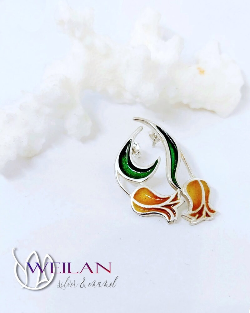 Hej'tulipán - Virágszálam aszimmetrikus ezüst tűzzománc fülbevaló OG