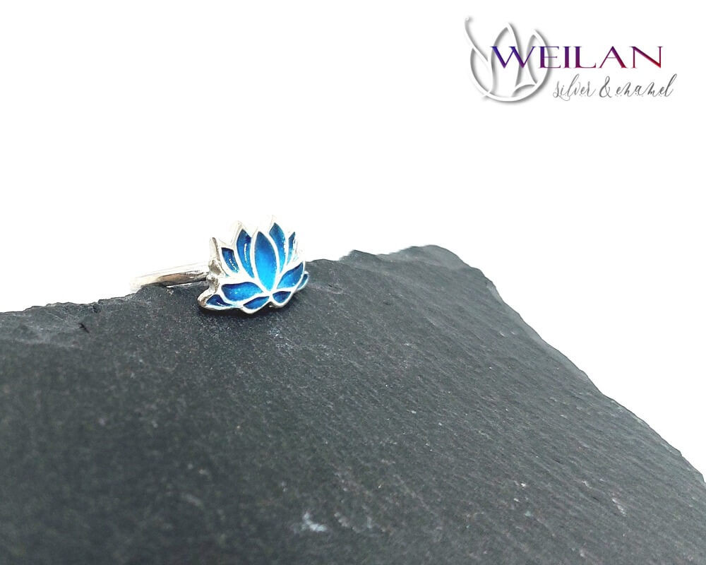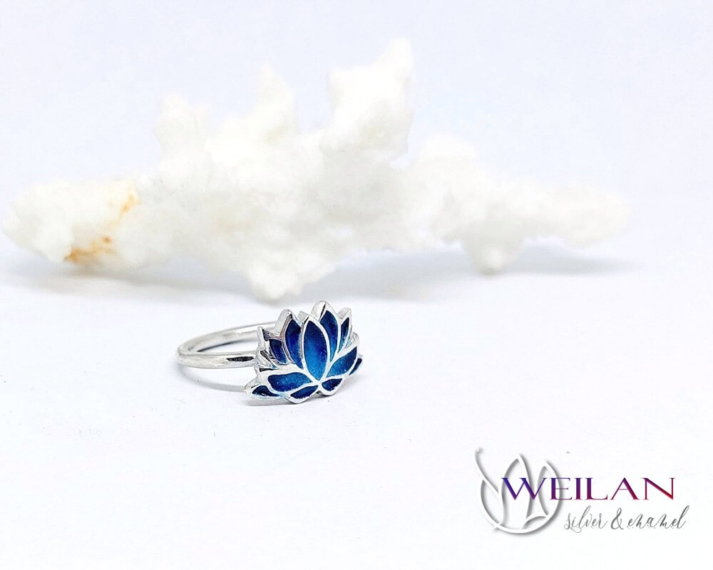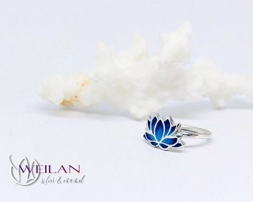 This beautiful 925 sterling Silver lotus ring now shines in shades of turquoise blue — a color symbolizing the triumph of the spirit, wisdom, and clarity of mind.