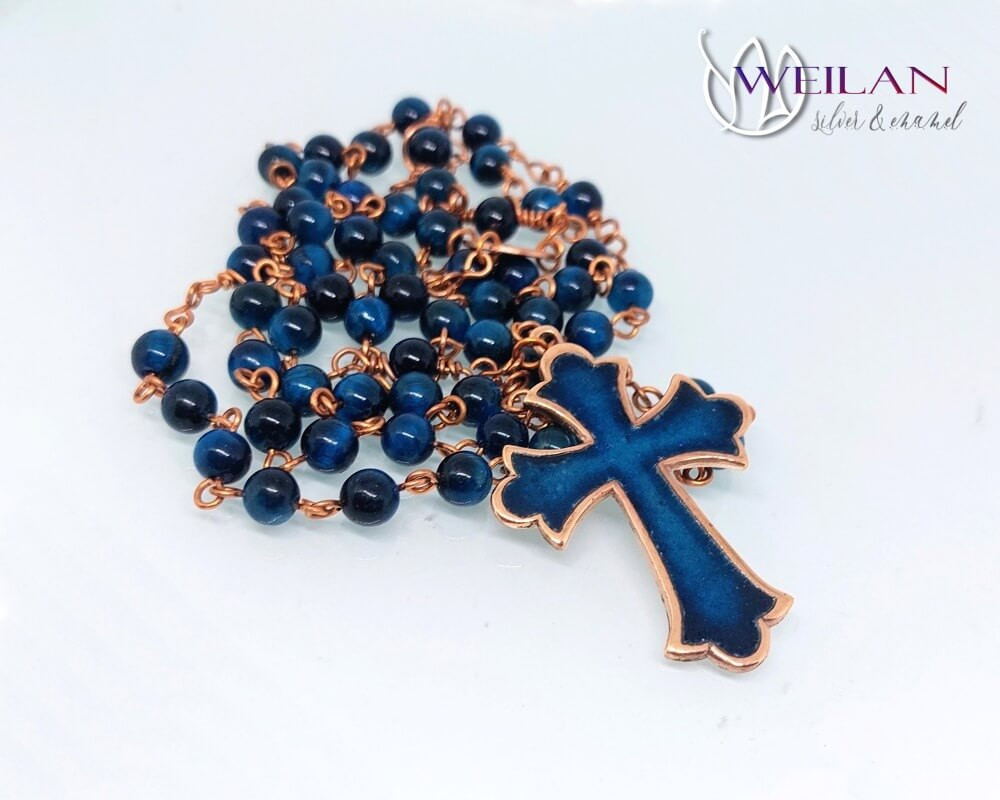A completely handcrafted, one-of-a-kind rosary featuring 6 mm blue tiger’s eye gemstone beads, each individually connected with hand-bent copper wire. Its centrepiece is a classic enamel cross in warm turquoise blue tones, created on a bronze base using recessed enamel technique.